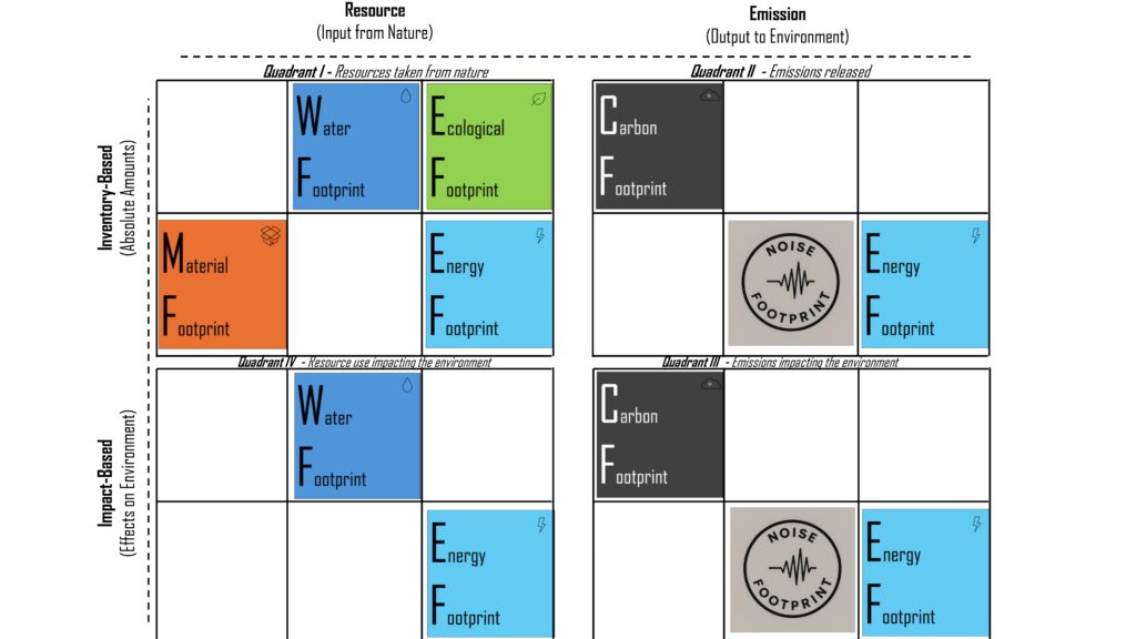 Environmental footprinting has transformed how society discusses responsibility, sustainability, and even everyday choices. It stands as a series of sustainability metrics, functioning as diagnostic tools that enable the detection and quantification of environmental and health impacts and support comparisons among products, services, and individual actions. Footprints can be classified according to their intended use and the environmental aspect they address, such as water, energy, or carbon footprints [3]. Footprints indicate an object dimension describing what the footprint analyses (i.e., “the footprint of…”) and a theme dimension that describes the effects or outcomes of the footprint (i.e., “the footprint on …”). They can be classified as inventory‑oriented footprints quantifying emissions in absolute terms and as impact‑oriented footprints characterizing emission inventories according to their contribution to specific environmental problems (see figure 1). Additionally, personal footprint calculators can motivate individuals to reduce their environmental impact, serving as awareness tools, yet they may also be perceived as mechanisms for shifting responsibility. Footprinting approaches, especially those applied to products, are often linked to Life Cycle Assessment (LCA), a method that evaluates impacts across all stages of a product or service life, from raw material extraction and manufacturing to use and end-of-life.
